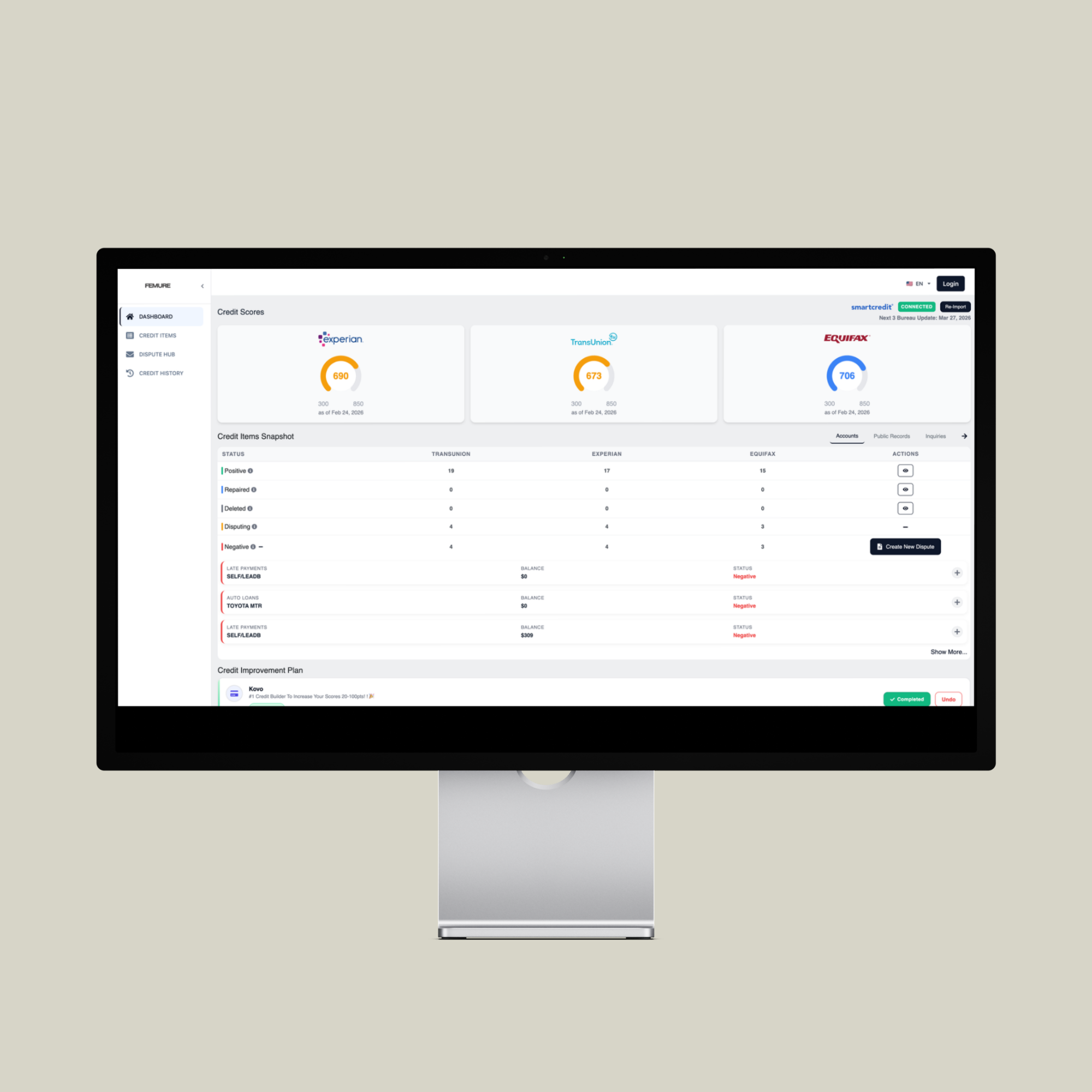 No need to create separate accounts with each credit bureau. FEMURE HAUS AI connects everything for you, powered by AI.