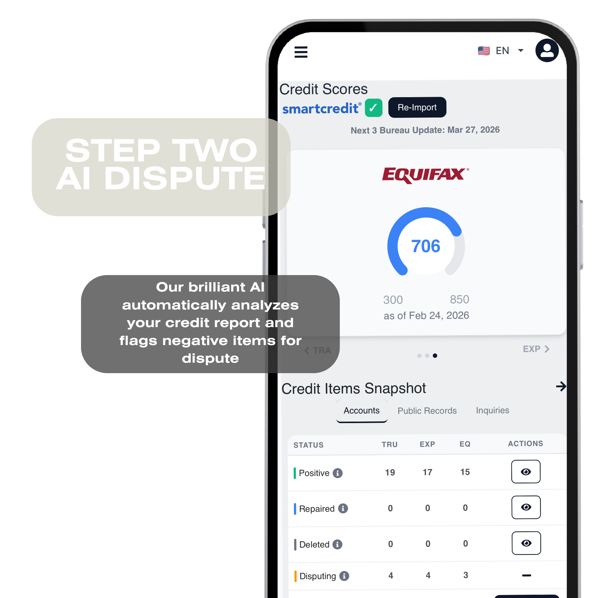 FEMURE HAUS AI securely links with SmartCredit to import and analyze your full 3-bureau report.